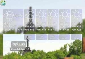 Քամին՝ արևմտյան՝ 2-5մ/վ։ Օդի ջերմաստիճանը հոկտեմբերի 1-ցերեկը, 2-ին աստիճանաբար կնվազի 5-8 աստիճանով, հոկտեմբերի 3-6-ին աստիճանաբար կբարձրանա 8-10 աստիճանով։